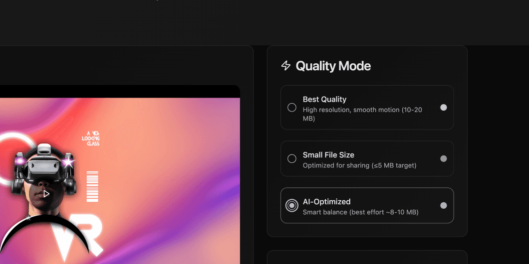I realised not every video needs the same settings. A talking head didn’t need 30 fps, but some of the other clips did. Instead of just guessing what to tweak, I added an AI-Optimised button that checks the video and picks settings that usually “just work.” It keeps motion smooth first, then adjusts size and colours if needed.