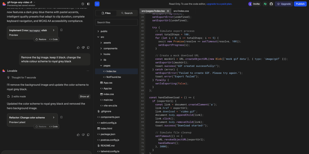 TL;DR. I needed a .mov-friendly, high-quality video→GIF tool that kept clips smooth and respected privacy. I couldn’t find one. So I scoped a tiny web app, built it in five Lovable phases, iterated prompts with ChatGPT, and wired a content-aware ffmpeg pipeline. It ships GIFs from common videos a instant delete.