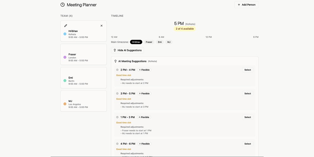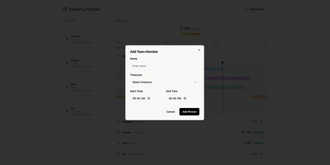 TL;DR. During my summer internship, I worked with a growth team spread across Argentina, Mexico, the UK, the US—and me in India. Without a shared calendar system, every meeting turned into timezone math and guesswork. I built Timezone Sync Meet, a simple planner that suggests the best times to meet, both within and outside working hours. It makes overlaps clear, trade-offs transparent, and has turned scheduling from a 15-minute debate into a 30-second decision.
