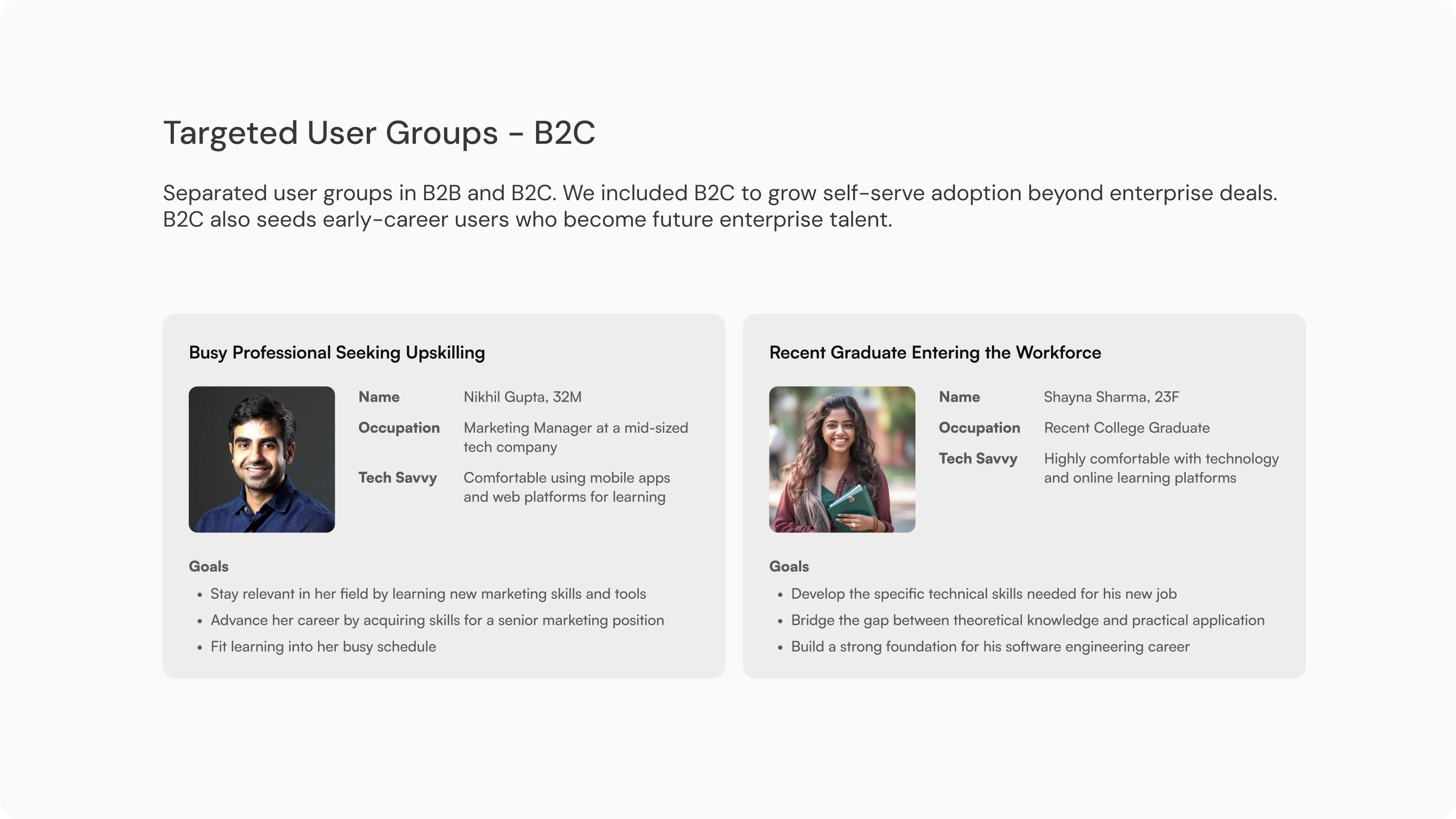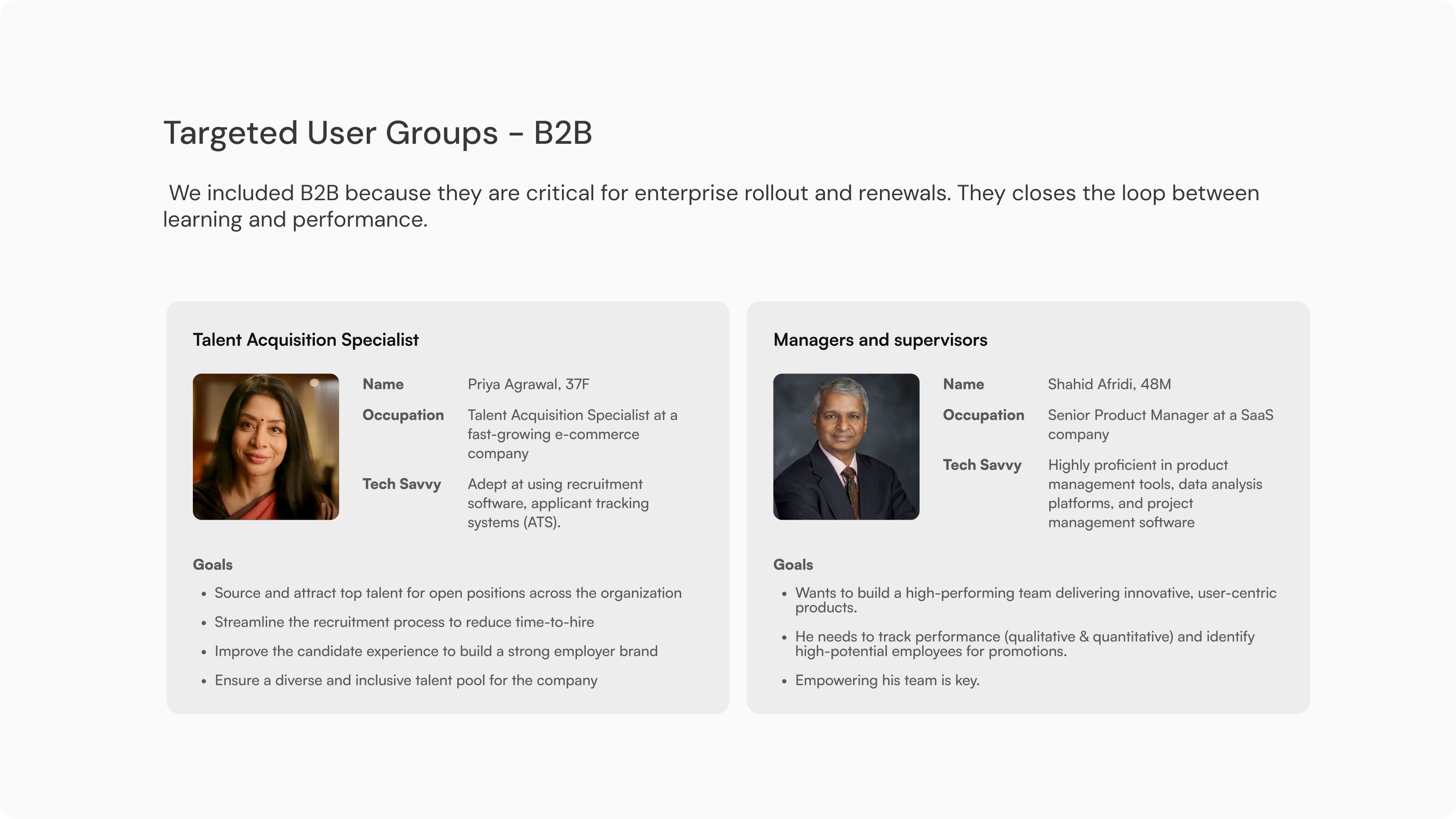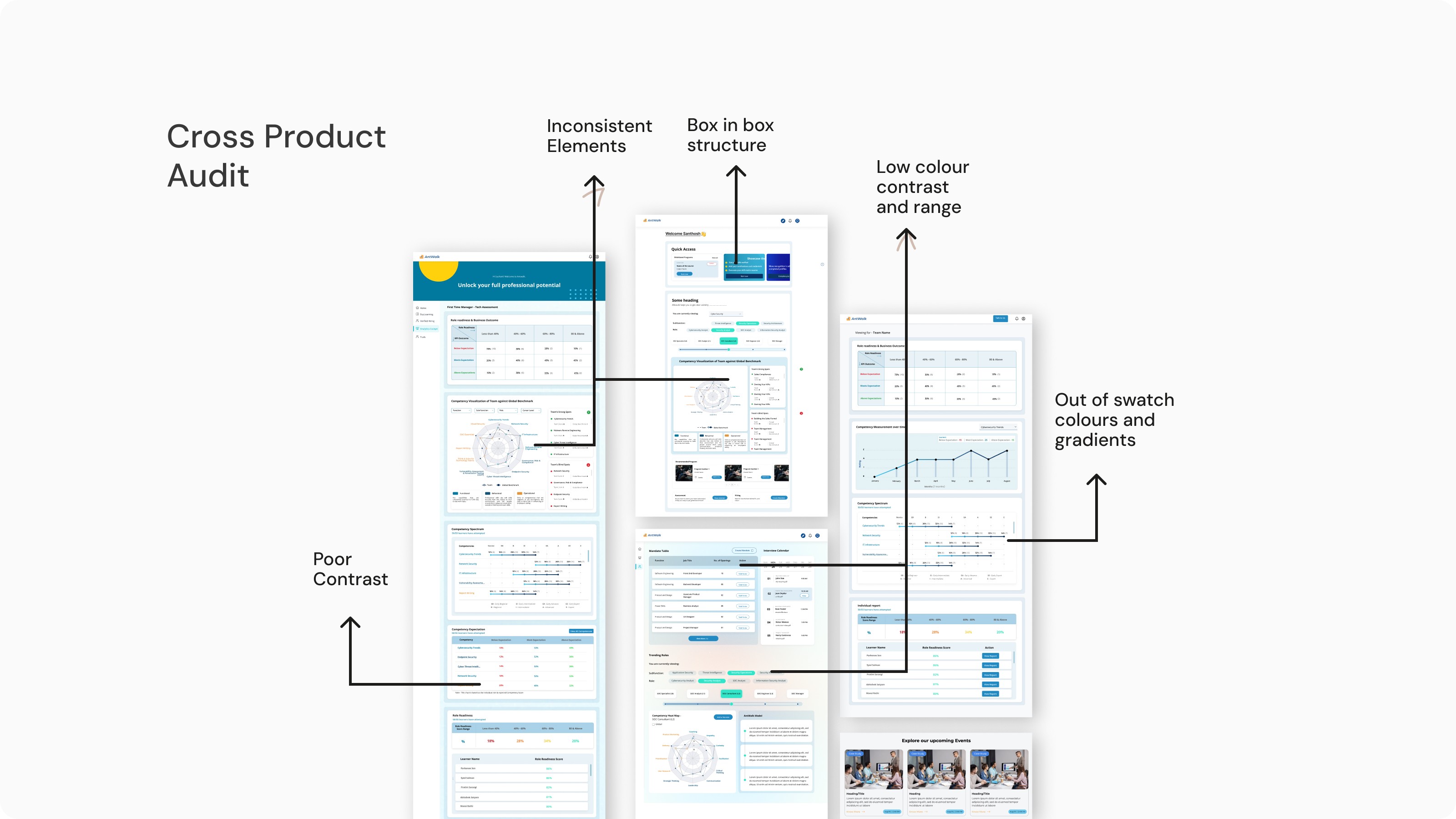 Each user role, admins, L&D managers, and learners, was experiencing the product differently. Multi-user workflows felt clunky, and the lack of a shared UI language led to frequent rework. Our early audits, including a component inventory, heuristics review, and quick accessibility checks, showed these weren’t just visual gaps; they were slowing the company’s ability to serve enterprise clients and scale effectively.