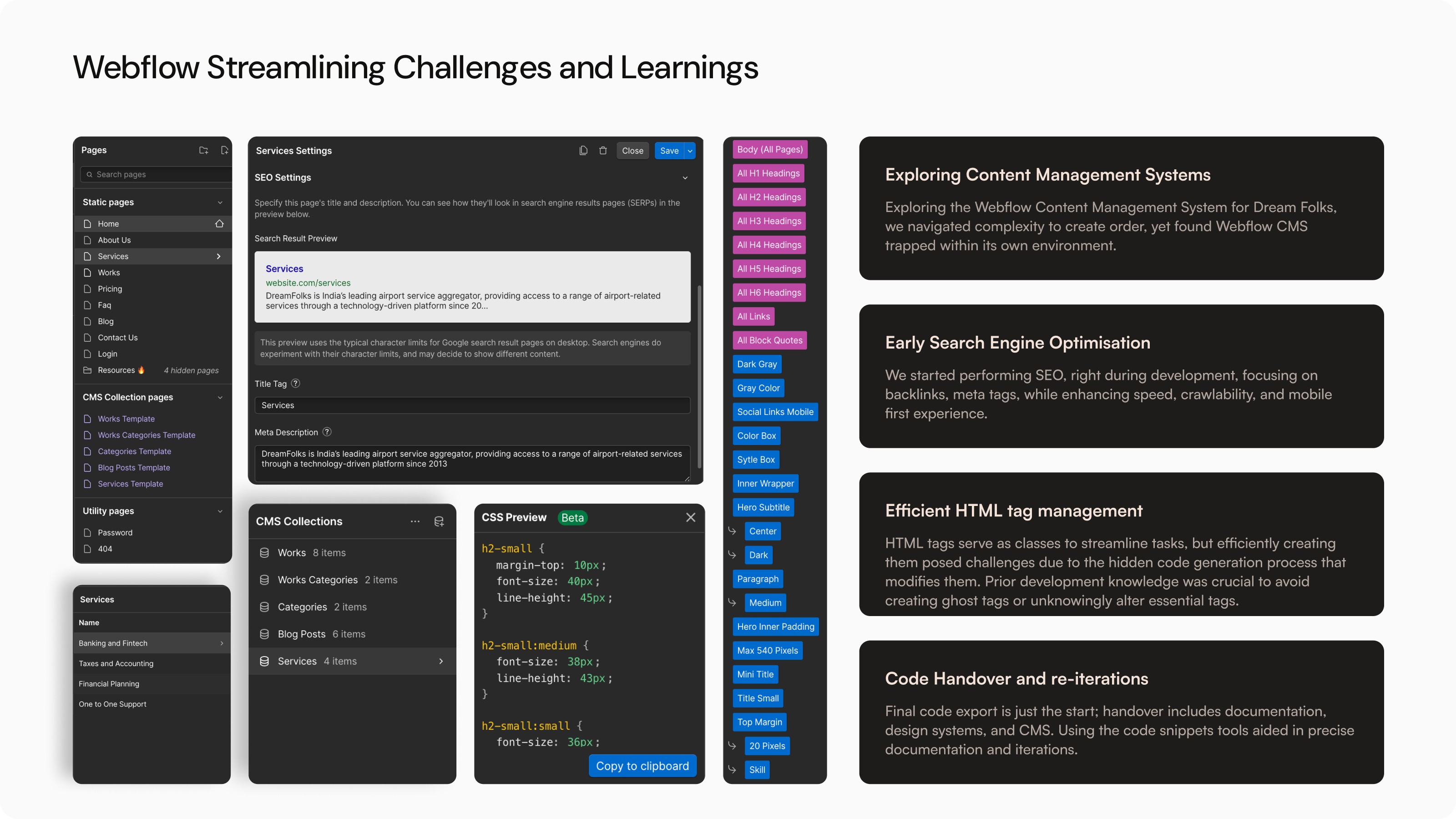 With a background in software engineering, I knew Webflow could bypass handoff delays and give us production-ready builds as we designed. I set up a design system, CMS collections, and reusable components inside Webflow so stakeholders could review live progress daily, instead of static decks. This choice turned an impossible cycle into a continuous flow.