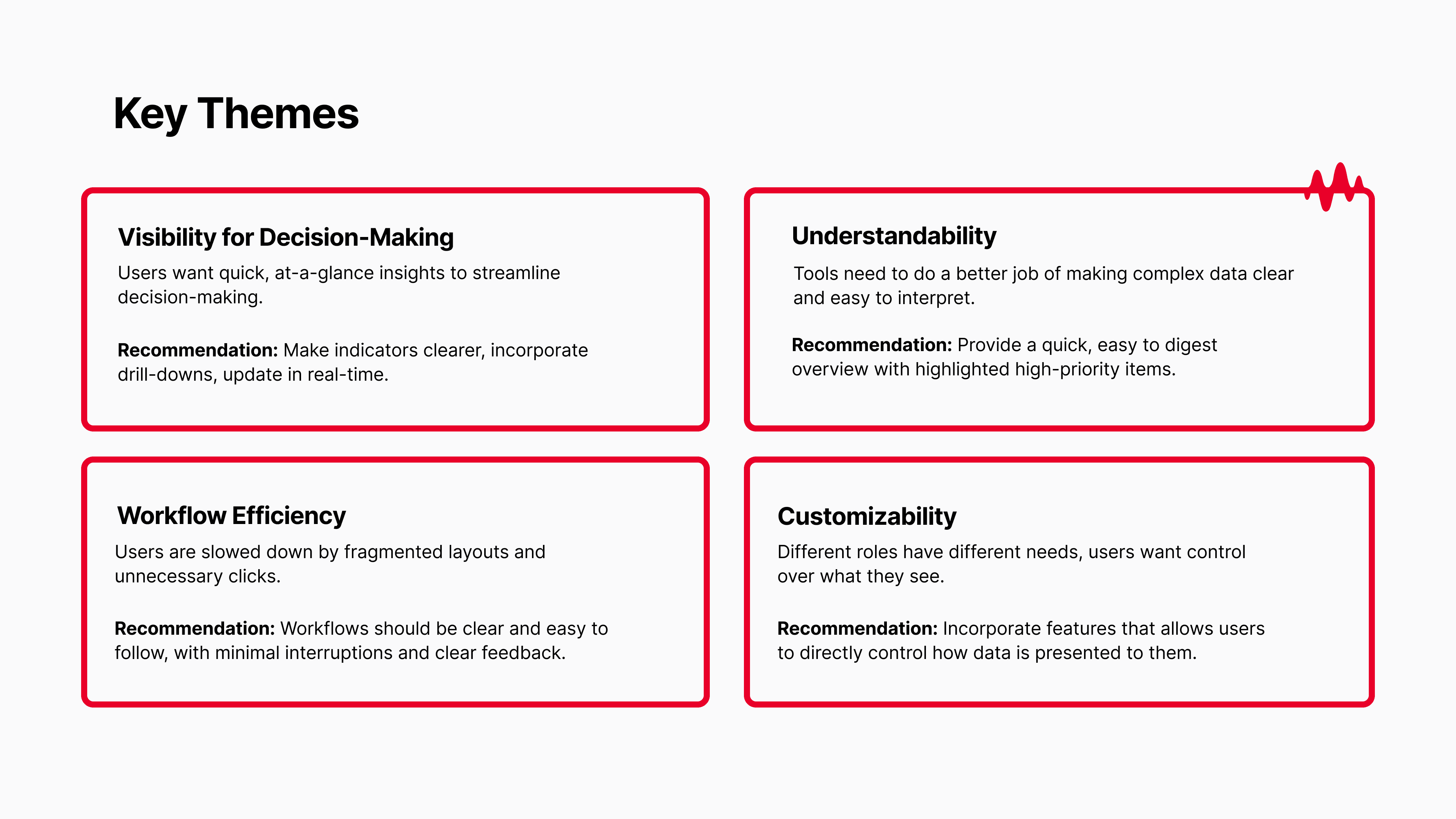 Four themes emerged: visibility, understandability, efficiency, and customizability.