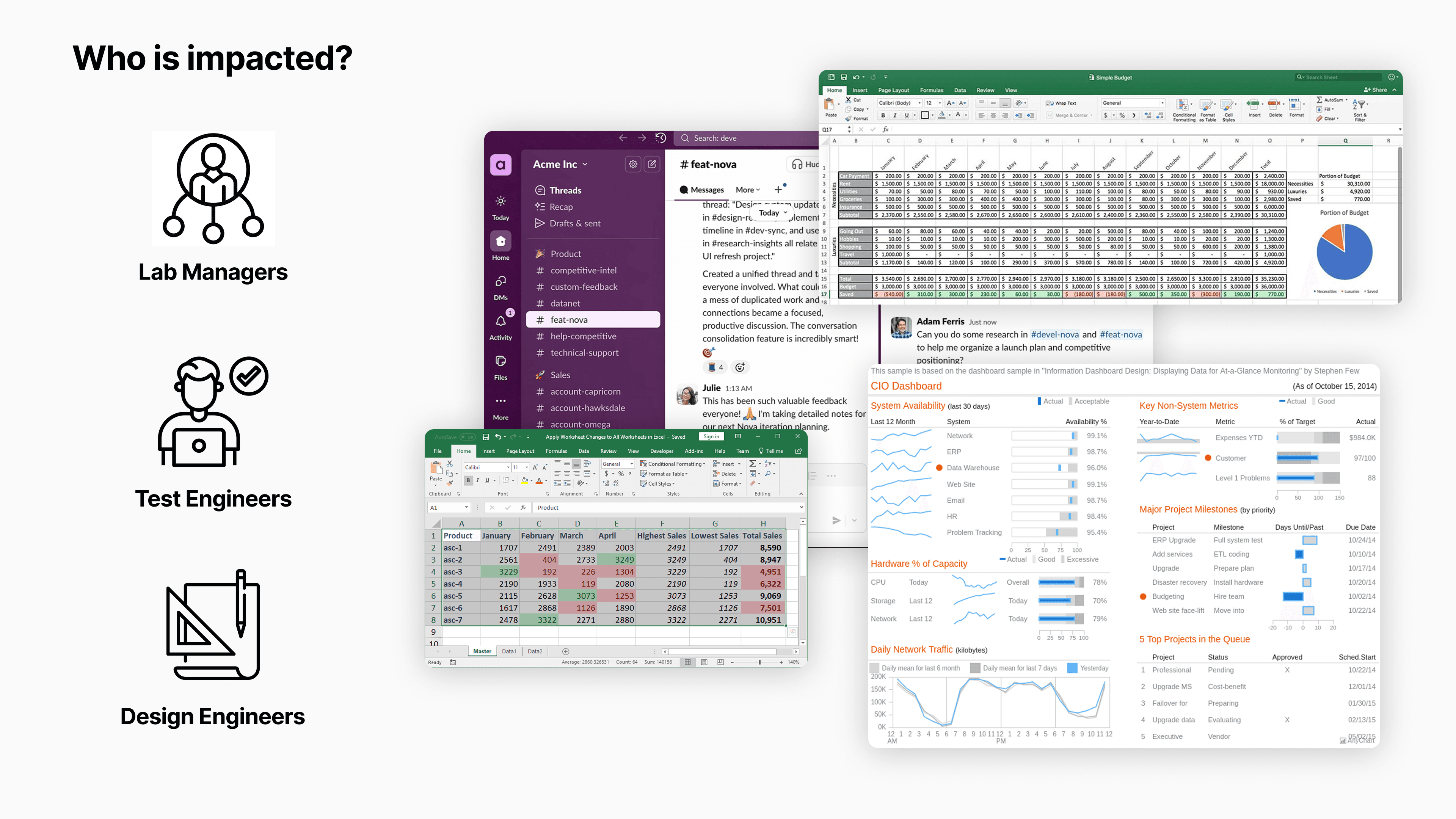 Users mentioned shifting through Excel sheets, Slack Channels, Email, Dashboards and other self made tools.