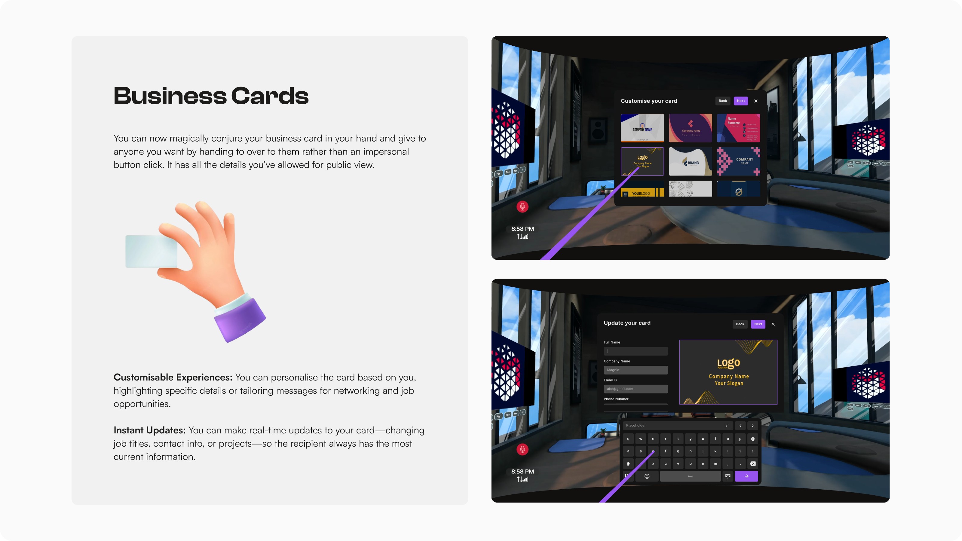 Each feature was designed to intercept churn at its exact trigger point. Orientation cues addressed early disorientation, lightweight social tools reduced crowd anxiety, and timed prompts helped manage headset fatigue. Instead of overhauling the entire platform, we created signature moments that made VR feel more intuitive and human. In tests, these interventions cut early exits and encouraged longer, more confident sessions.