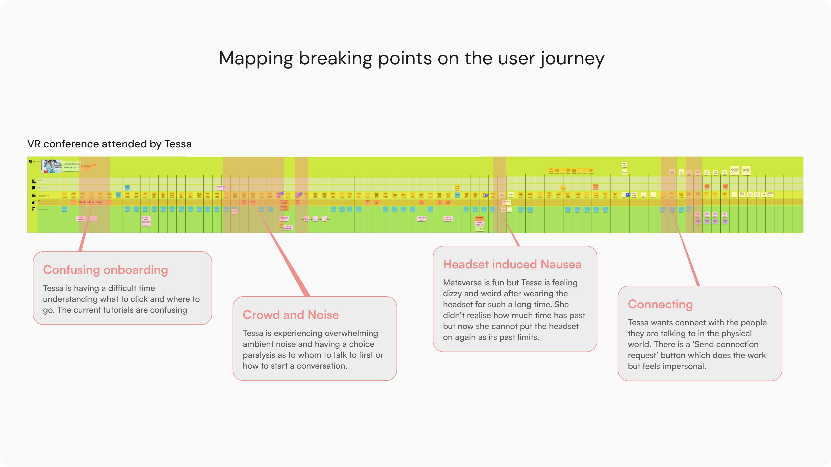 We conducted journey mapping alongside qualitative interviews to identify the exact drop-off points. Three patterns stood out: users felt disoriented during onboarding, overwhelmed in shared spaces, and fatigued from prolonged headset use. These weren’t isolated bugs; they were emotional blockers that made users feel anxious or lost. Rather than overhaul the entire experience, we focused on the highest-friction moments and asked
