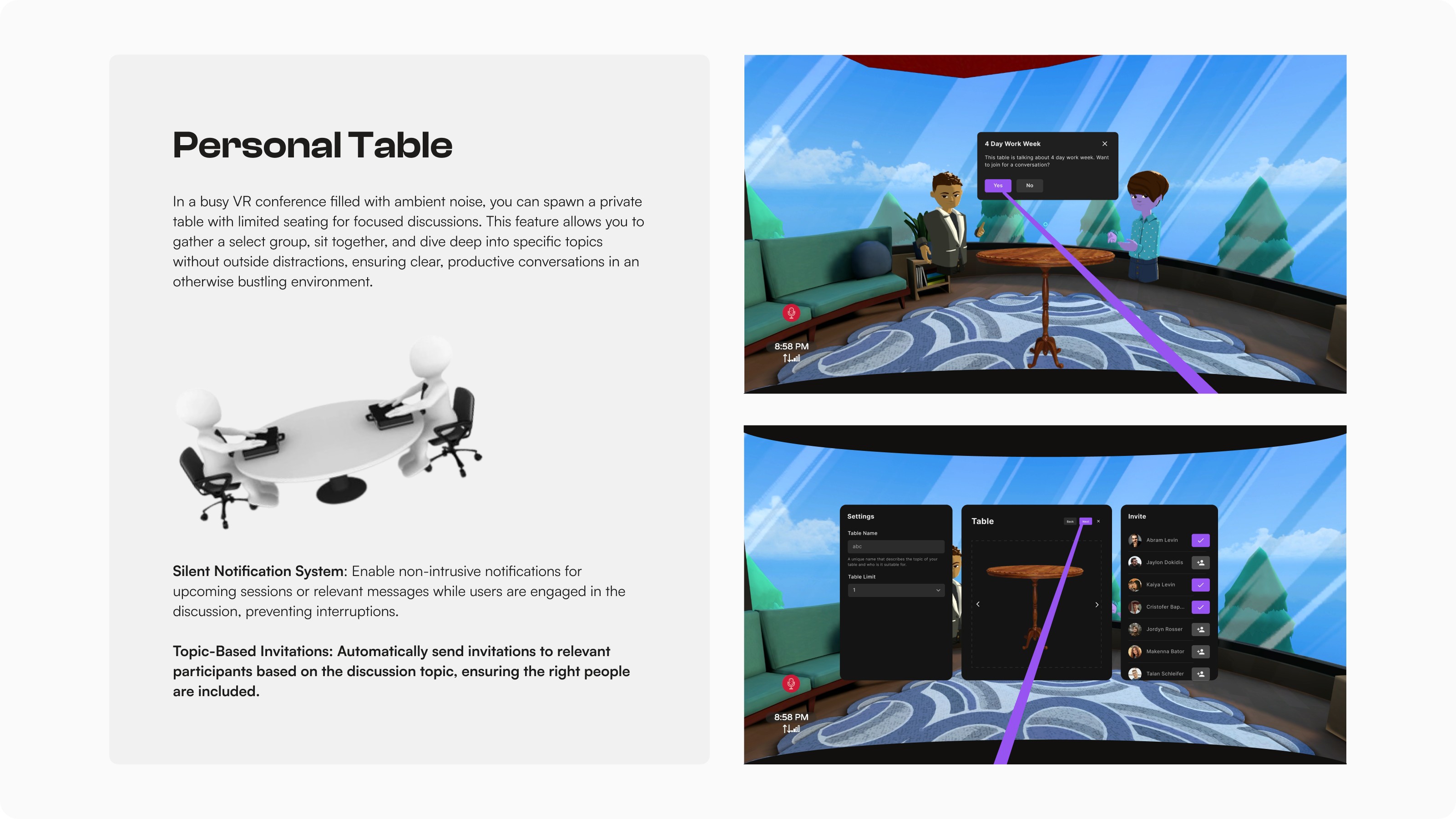 In user tests, the new signature moments significantly lowered early exits and extended session length; break prompts were the most-cited aid, and private tables prompted requests for richer small-group features. Production slipped past deadlines, and as the AI boom hit, leadership shifted focus to AI-powered event tools, reallocating resources and leaving the VR rollout on hold for future exploration.